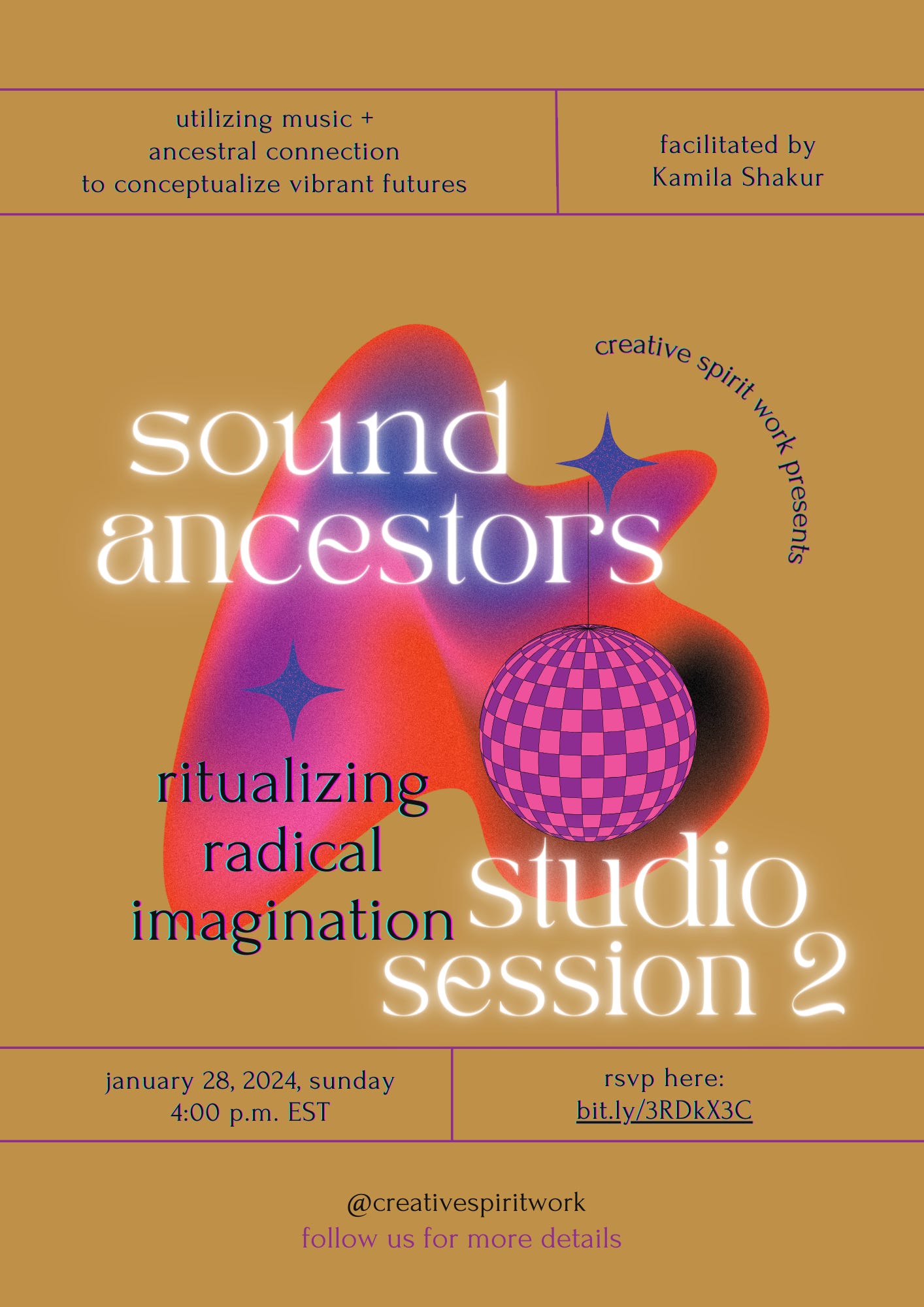 Sound Ancestors Studio Session 2 is slated for January 28th. We will be focusing on the role that creativity and ancestral connection play in ritualizing radical imagination and why it is an essential technology right now. 9 creators will be able to attend this 40-minute container and it is still donation-based. 7 spots are still available. It will not be recorded, but you will receive a follow-up email afterward if you sign up and miss the session. Get your tickets here.